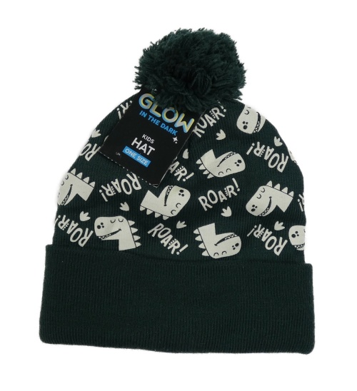 Nové - khaki pletená čapica s dinosaurami a brmbolcom