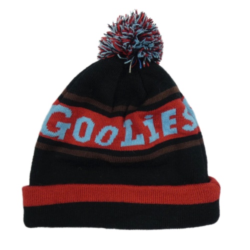 Čierno-červená pruhovaná čapica s nápisom a brmbolcom