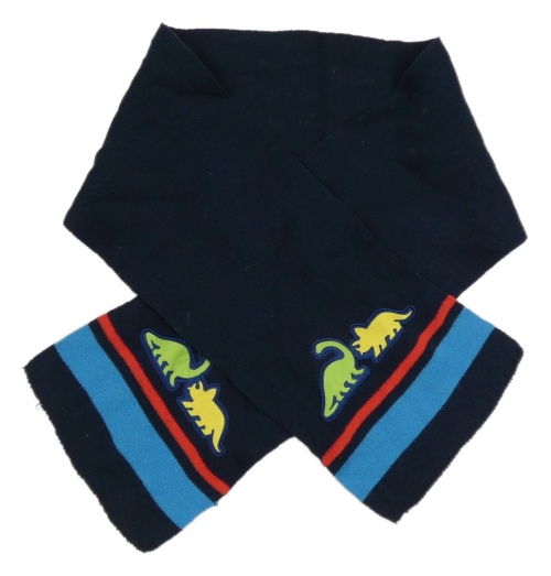 Tmavomodrá pletená šál s modrým pruhom a dinosaurami