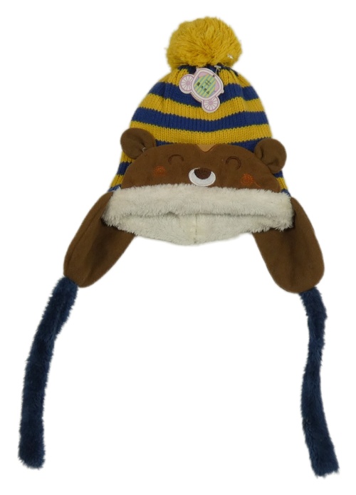 Nové - Žlto-tmavomodrá pruhovaná pletená zateplená čapica s medvěďom a brmbolcom