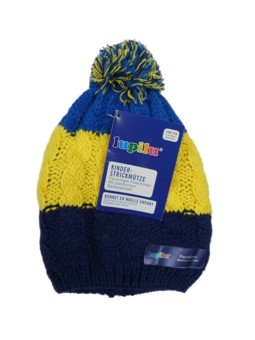 Nové - Tmavomodro-žlto-modrá pletená podšitá čapica s brmbolcom Lupilu