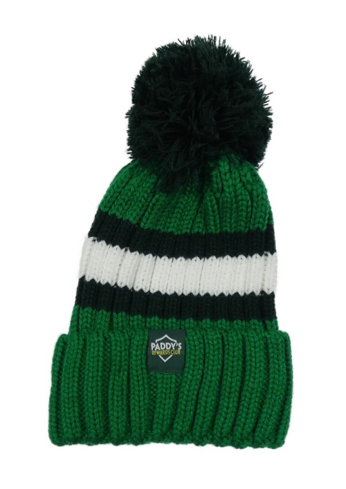 Zelená pletená čapica s bielým pruhom a brmbolcom