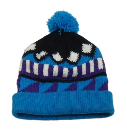 Modro-čierno-fialová vzorovaná čapica s brmbolcom