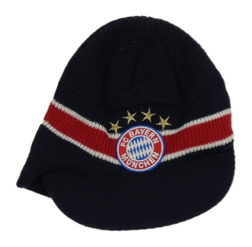 Tmavomodro-červená žebrovaná pletená fotbalová čepice FC BAYERN MÜNCHEN a pruhmi a kšiltem