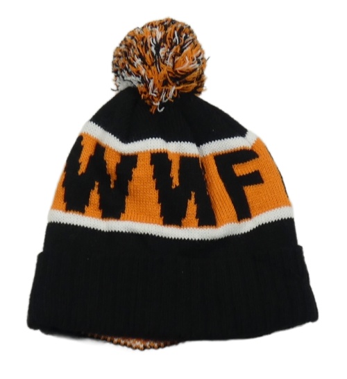 Čierno-bielo-oranžová čapica s nápisom a brmbolcom