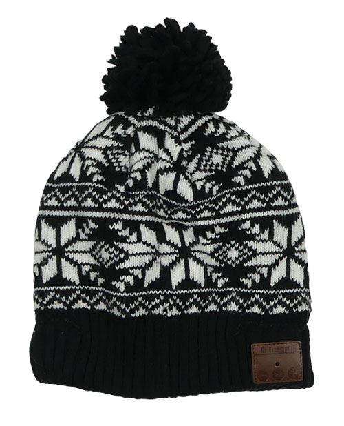 Čierno-biela vzorovaná pletená čapica s vločkami a bluetooth a brmbolcom