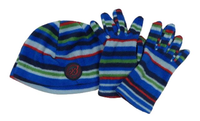 2set - Modro-červeno-zelené pruhované fleecové prstové rukavice + čapica