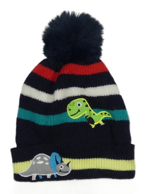 Tmavomodro-farebná pruhovaná čapica s dinosaurami a brmbolcom
