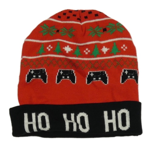 Červeno-čierna vianočná čapica s nápisom a ovladači a stromčekmi a vločkami
