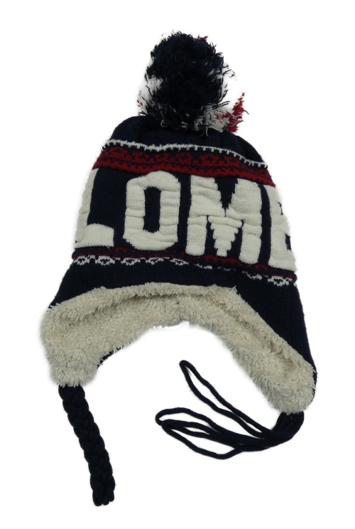 Tmavomodrá pletená zateplená čapica s nápisom a vzorom a brmbolcom