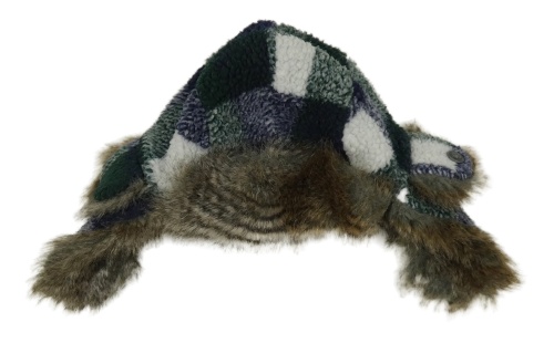 Tmavomodro-bílo-zelená kostkovaná huňatá beranice s kožešinou