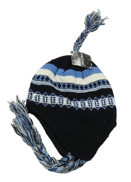 Čierno-modro-biela čapica so vzorom a strapcemi