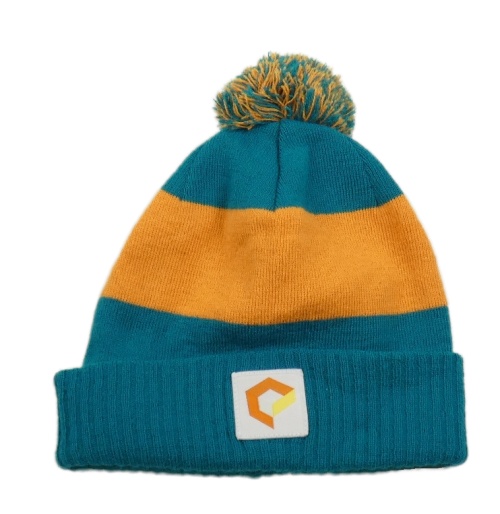 Modrozeleno-oranžová pletená čapica s nášivkou a brmbolcom