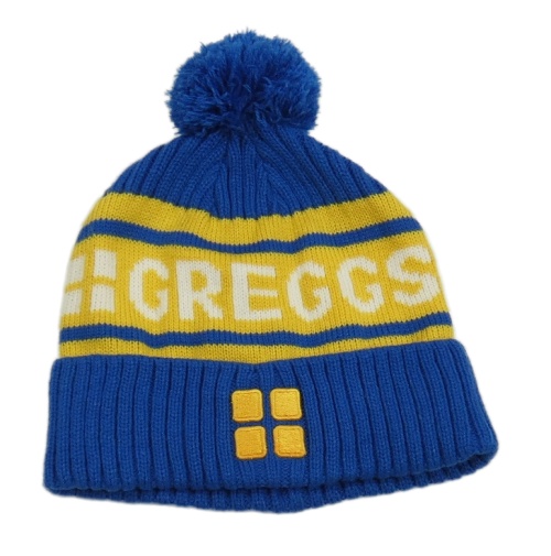 Tmavomodro-žltá pletená čapica s nápisom a brmbolcom