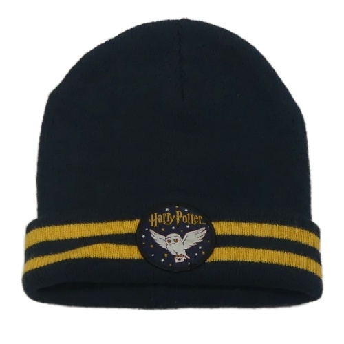 Tmavomodrá pletená čapica s nášivkou s Hedwigou - Harry Potter a pruhmi
