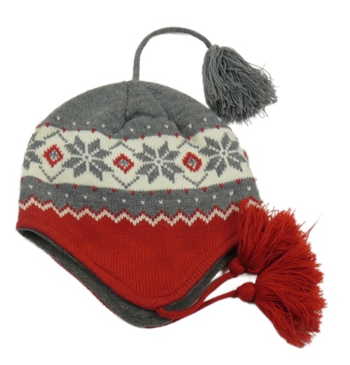 Sivo-červeno-smotanová vzorovaná čapica s strapcemi