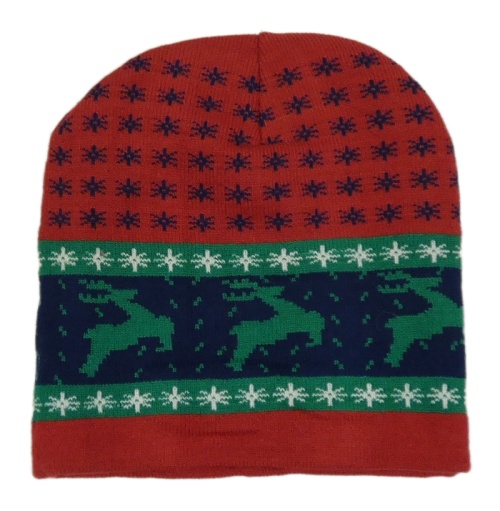 Červeno-zeleno-modrá vzorovaná pletená čapica so sobmi