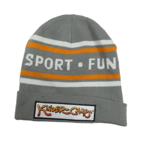 Sivo-oranžovo-biela čapica s pruhmi a nápismi