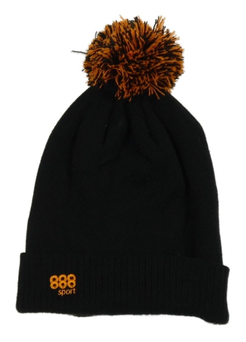 Čierna pletená čapica s oranžovou výšivkou a brmbolcom