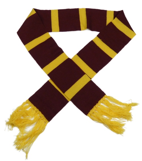 Tmavovínovo/žlutá pruhovaná pletená futbalová šál s třásněmi - na fandění