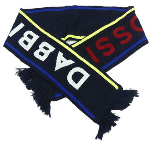 Tmavomodro-farebná šál s nápismi a pruhmi