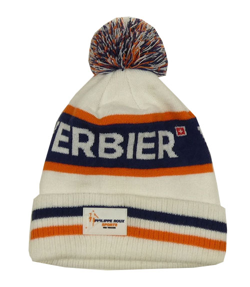 Smetanovo-tmavomodro-oranžová čapica s nápisom a brmbolcom
