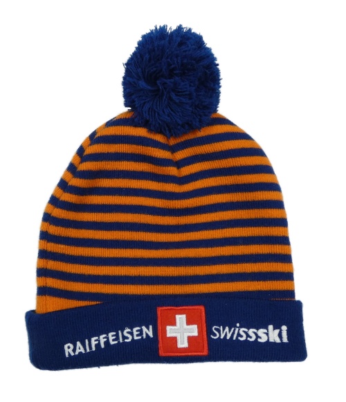 Tmavomodro-oranžová pruhovaná čapica s nápismi a brmbolcom