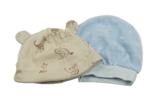 2x čepice - světlemodrá sametová + béžová s obrázkami