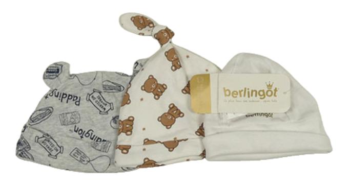 3x bavlněná čepice - šedá melírovaná s obrázky - Paddington + biela s medvědy + biela s nápisom