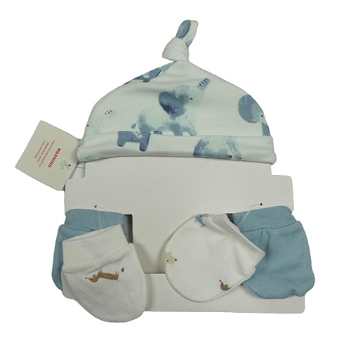 Nové - 3set - Mátová bavlnená čapica so slony + světlemodré rukavičky + bílé so psy