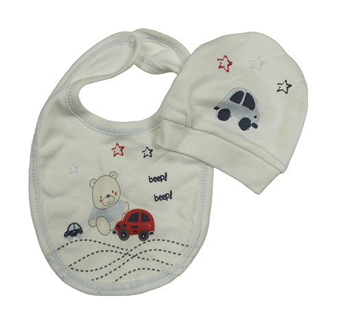 2set - Smotanová bavlnená čapica s autom a hvězdami + slinták s medveďmi a autami