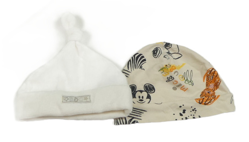 2x čepice - béžová bavlnená s Mickeym + bílá sametová s nášivkou