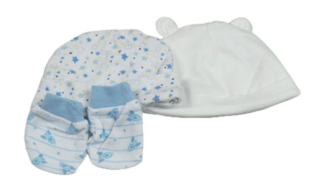 3Set - 2x - Bílá čepice - s hvězdičkami, s uškami F&F + bílo/světlemodré rukavice s raketami