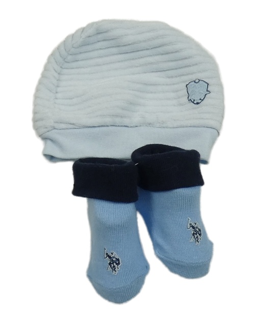 2set- svetlomodrá pruhovaná zamatová čapica s nášivkou+ modré ponožky
