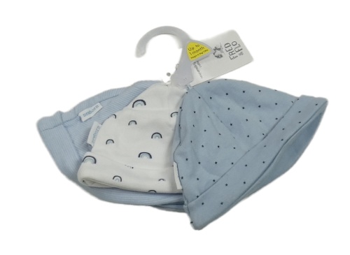 Nové - 3x čepice - modrá puntíkatá + modrá pruhovaná + biela s duhami F&F
