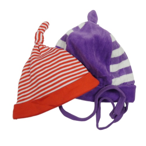 2x čepice - červeno-bílá pruhovaná bavlněná + fialovo-bílá sametová s pruhmi