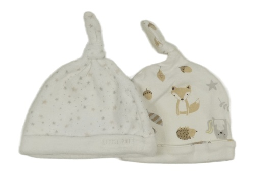 2x čepice - biela s hvězdičkami + biela so zvířaty