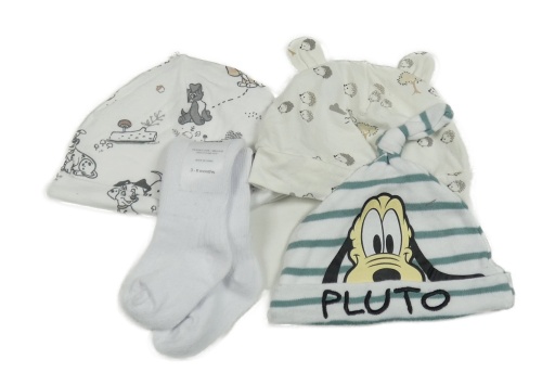 4set- biela pruhovaná čapica s Plutem+ biela s ježky+ biela s obrázky+ biele ponožky