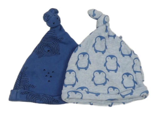 2x - Čepice - Modro/tmavomodrá s medvedíkmi F&F, modro-bílá pruhovaná melírovaná s tučňáčky
