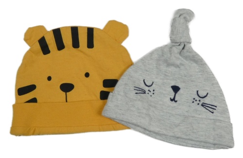 2x čepice - sivá s čumákem + okrová - tiger