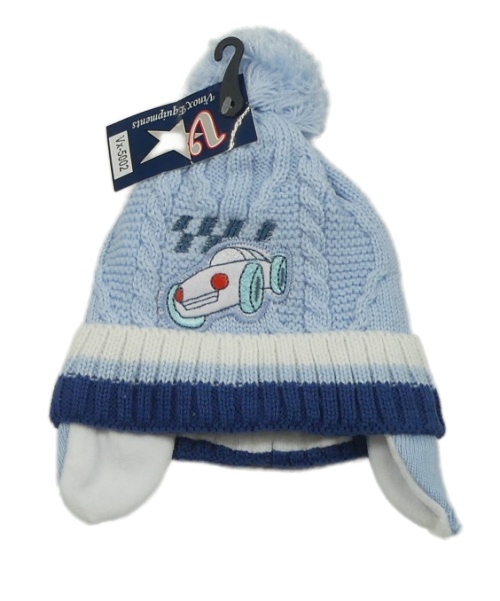 Nové - Modrá pletená podšitá čapica s autom a kapucňou
