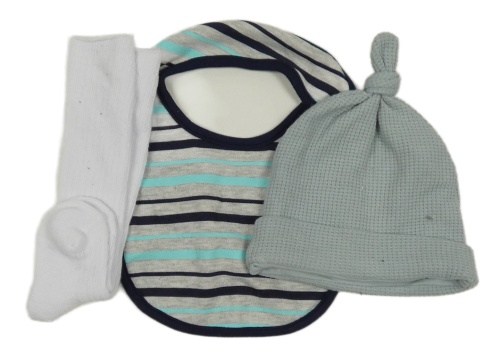 3set - Zelenošedá rebrovaná čepice + sivo-tmavomodro-tyrkysový pruhovaný slinták + biele ponožky