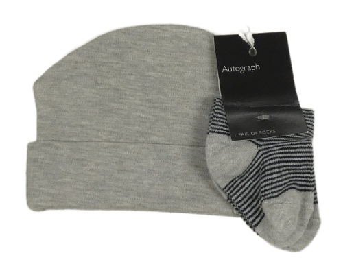 2set - Sivá melírovaná bavlnená čepice + sivo-tmavomodré pruhované ponožky