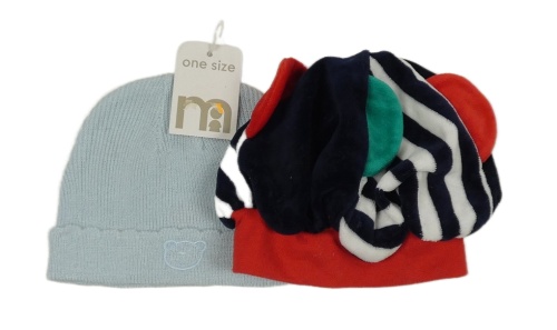 Nové - 2x - Tmavomodo-pruhovaná zamatová + svetlomodrá pletená čapica Mothercare