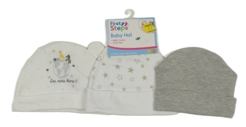 Nové - 3x bavlněná čepice - biela s hvězdami + biela s výšivkou + sivá