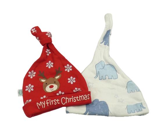 2x bavlněná čepice - smotanová so slony + červená so sobom a vločkami