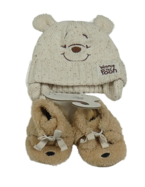 Nové - 2set - Svetlobéžová melírovaná čepice - Pú + béžové chlpaté cápačky s čumákem vel. 17