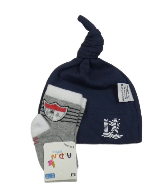 2set - Tmavomodrá bavlnená čapica s potiskem + sivo-biele ponožky s erbem