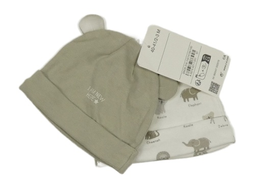 Nové - 2x bavlněná čepice - zelenošedá s nápisem + biela so zvířaty C&A