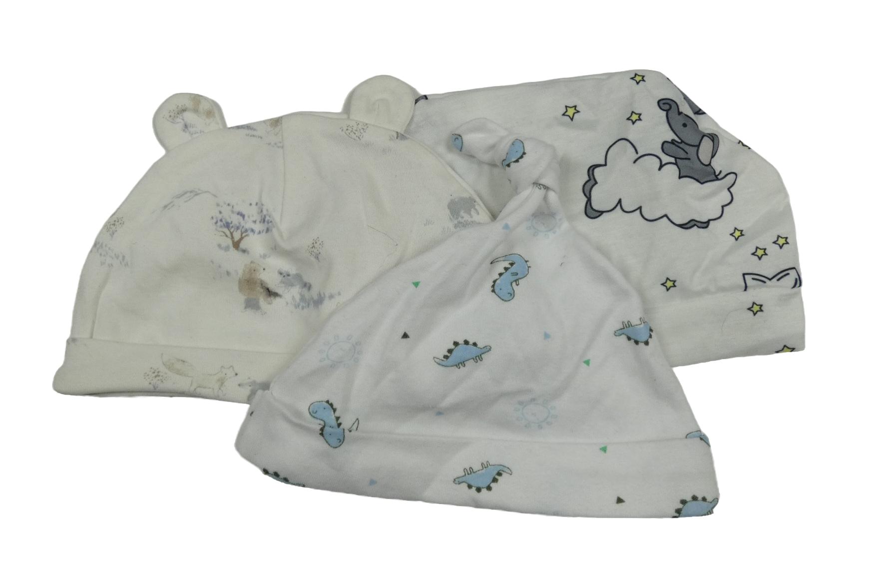 3x čepice - biela s dinosaury + biela so slony + smotanová s obrázkami
